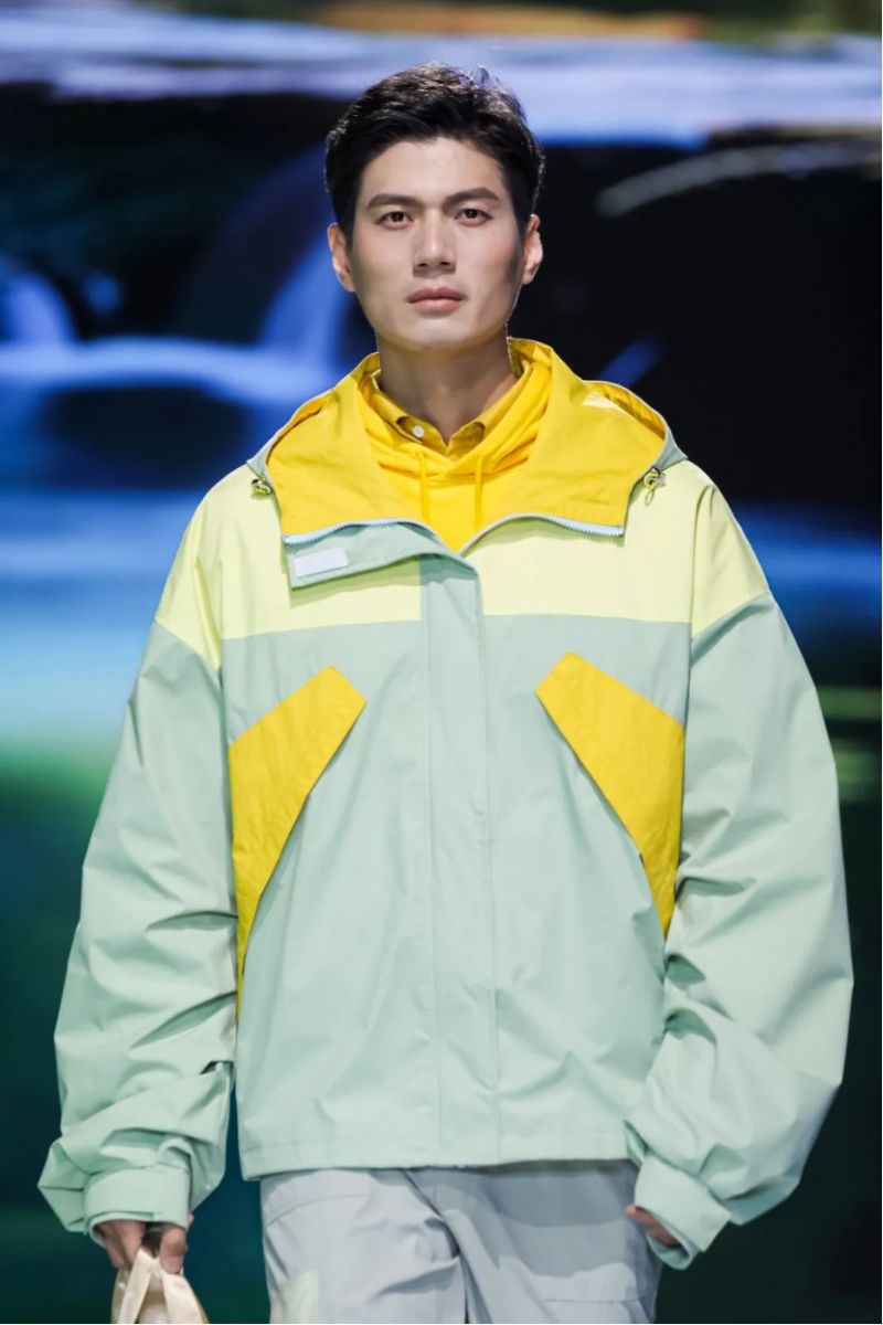 本系列設(shè)計(jì)色彩取之于自然萬(wàn)物中的天、地、水、植,例如嫩芽黃、萊姆綠、香水藍(lán)等等。同時(shí)在面料上的選擇也考慮到了不同溫度環(huán)境下的穿著體驗(yàn),包括不同克重的錦綸、滌綸面料,同時(shí)考慮到了環(huán)保因素,一部分漁網(wǎng)回收的錦綸同樣運(yùn)用到了此系列中。通過(guò)色彩與面料的巧妙搭配,讓本系列整體風(fēng)格顯得明快自然、舒適閑逸,通勤與戶外的有機(jī)結(jié)合,也讓此類輕戶外風(fēng)格更能得到當(dāng)下消費(fèi)者的青睞。