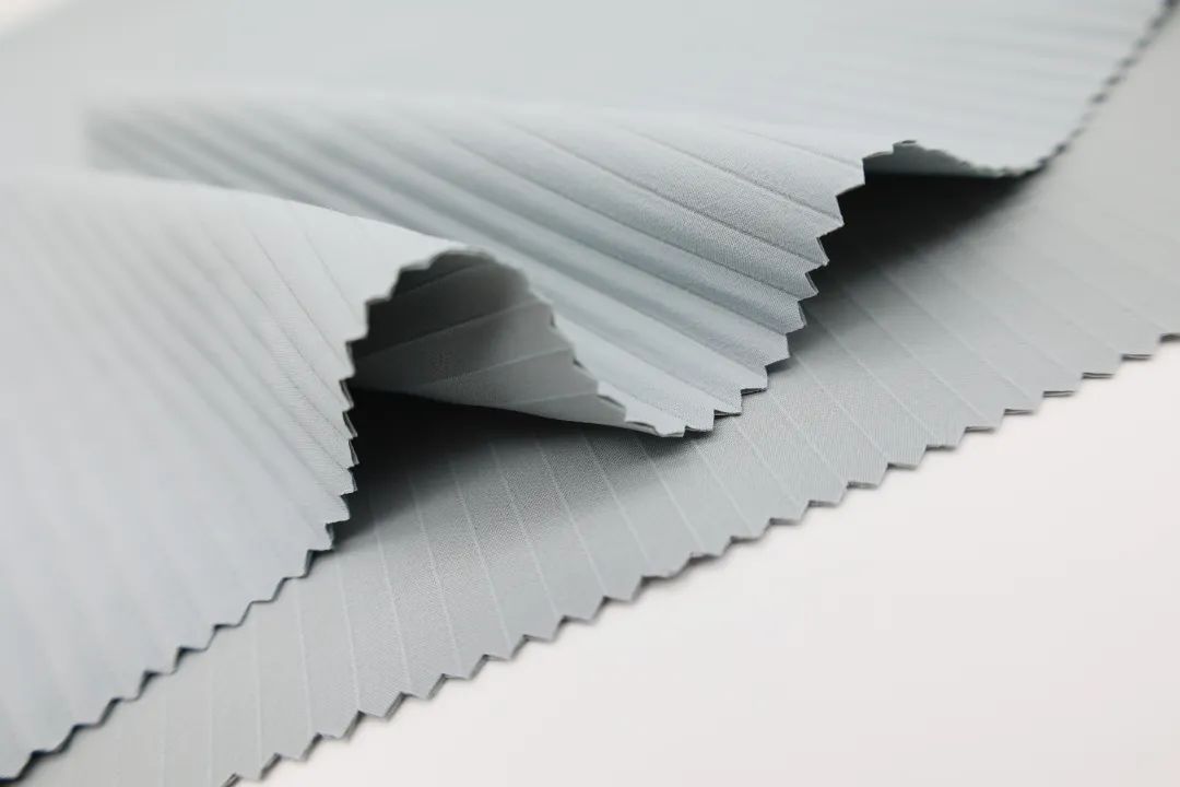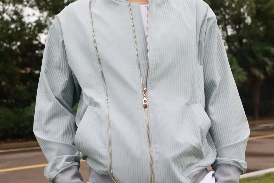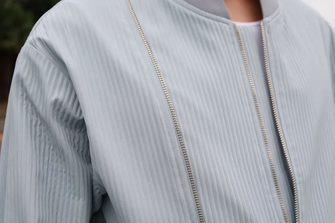 該面料采用雙層中空結(jié)構(gòu)工藝,有骨感,挺闊有型;布面條紋設(shè)計(jì)輕微隆起立體感強(qiáng),具有獨(dú)特機(jī)理風(fēng)格;緯向彈力工藝,微彈穿著更舒適;獨(dú)特織造工藝布面呈現(xiàn)朦物感,亞光色澤更高級(jí);手感上具有棉軟觸感。
