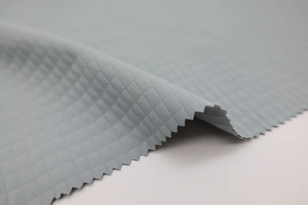 該面料采用雙層中空結(jié)構(gòu)工藝,有骨感,挺闊有型;布面格子紋樣設(shè)計(jì)輕微隆起立體感強(qiáng),具有獨(dú)特機(jī)理風(fēng)格;緯向彈力工藝,微彈穿著更舒適;獨(dú)特織造工藝布面呈現(xiàn)朦物感,亞光色澤更高級(jí);手感上具有棉軟觸感。